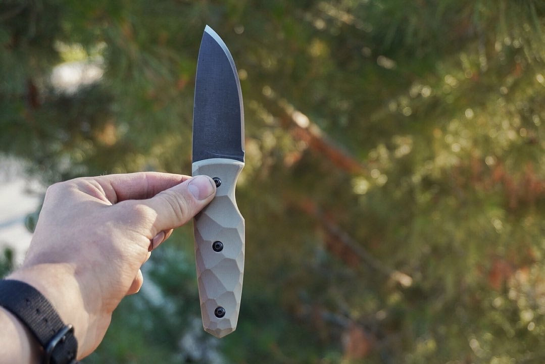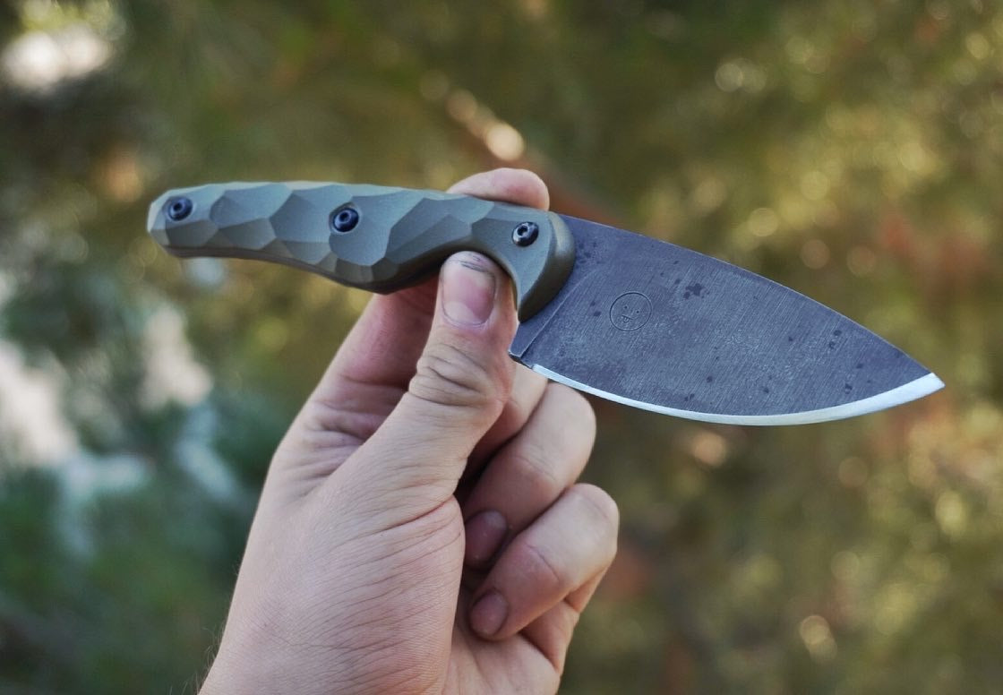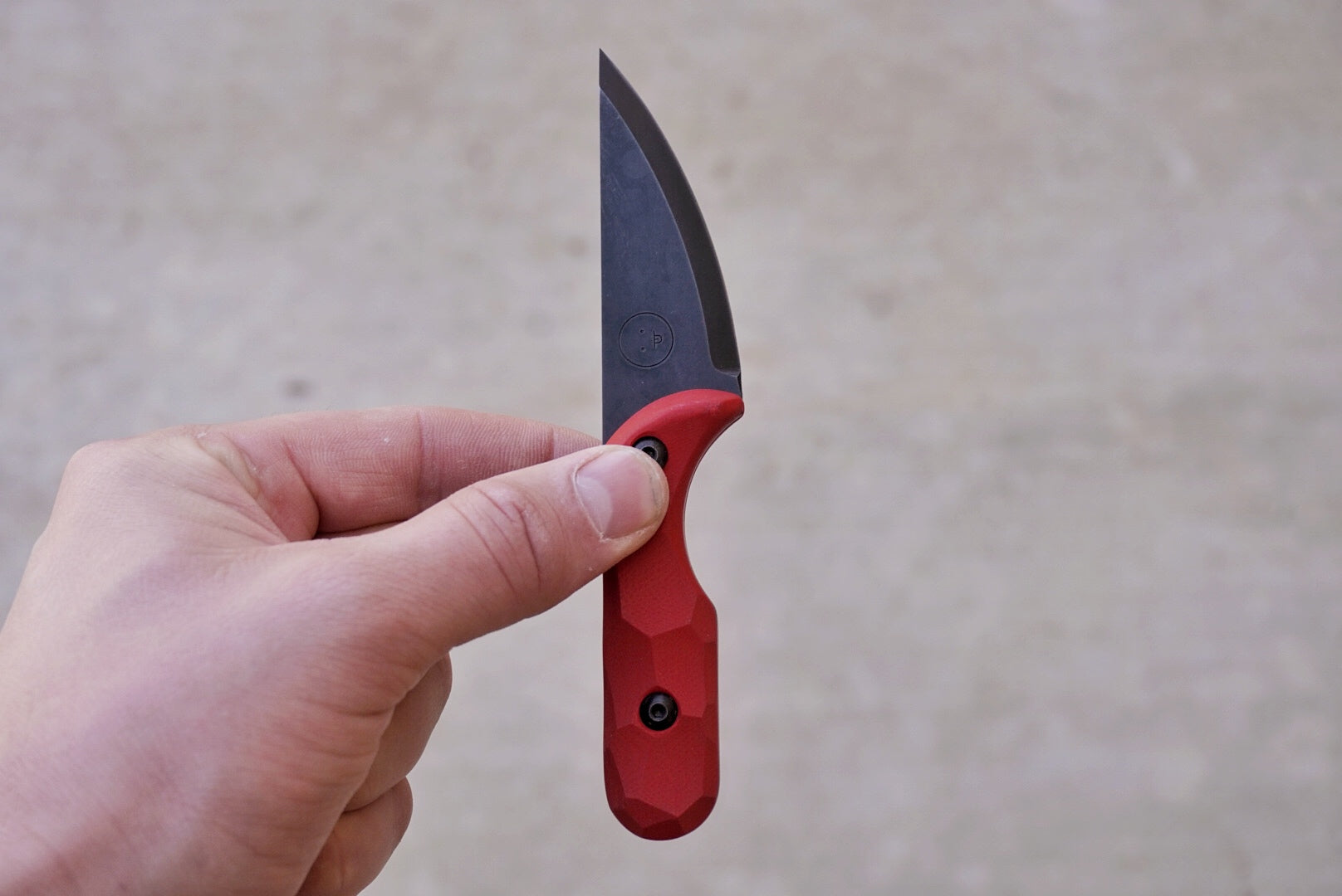 The curved spine and deep first finger groove give you the option to use a punch grip without worrying about your finger sliding forward and getting cut. This and the sharp tip give yo the option to fight with this knife making it much more versatile option for both hunting and tactical applications.
