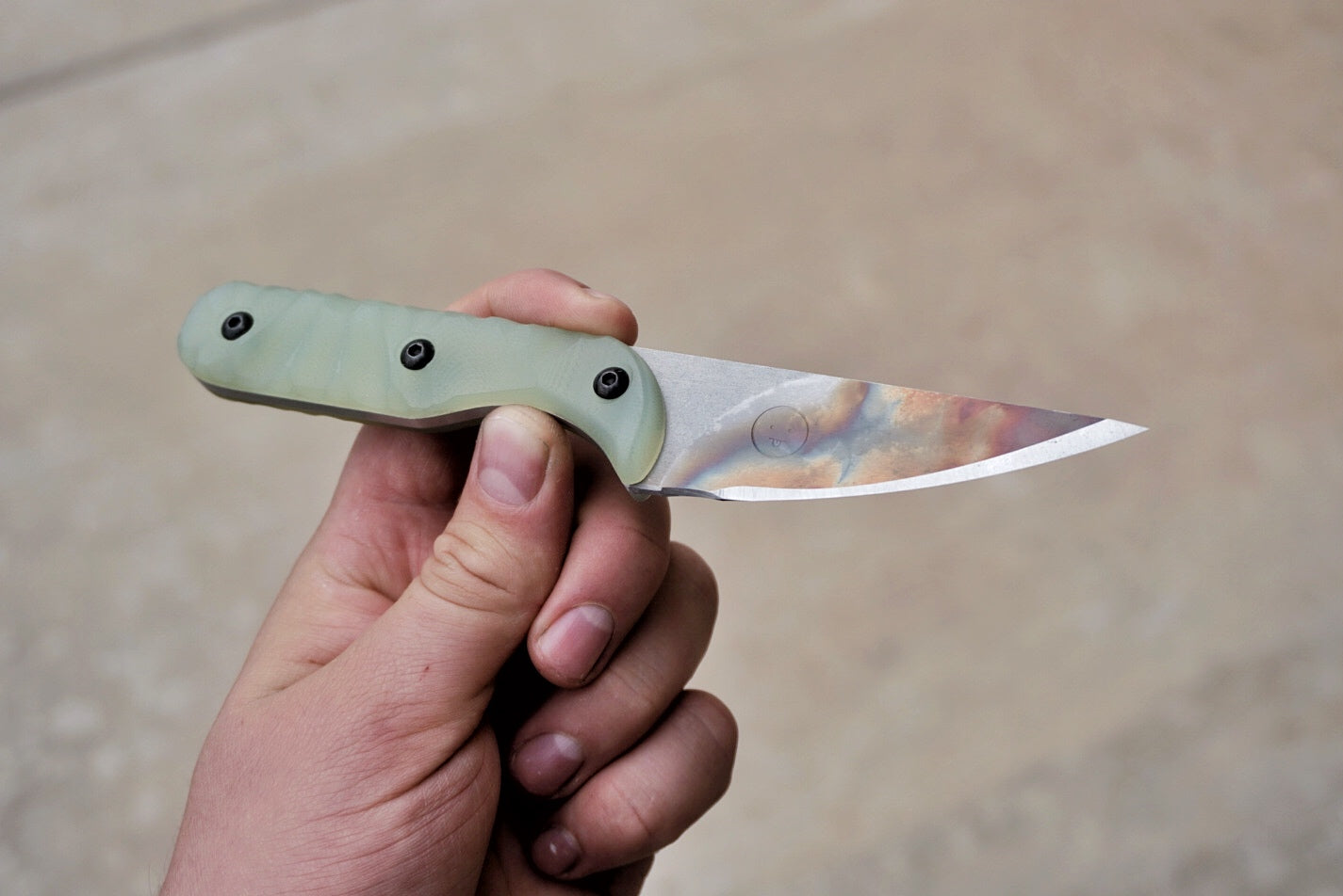 An additional feature is the grind. It’s a flat grind that maintains the spine thickness to the end just like the full size beekeeper. This is why you see an progressively larger secondary bevel (cutting edge). This adds to the rigidity of the blade in both cutting and penetrating.